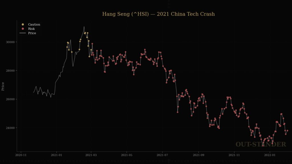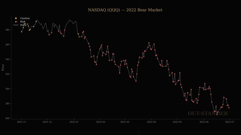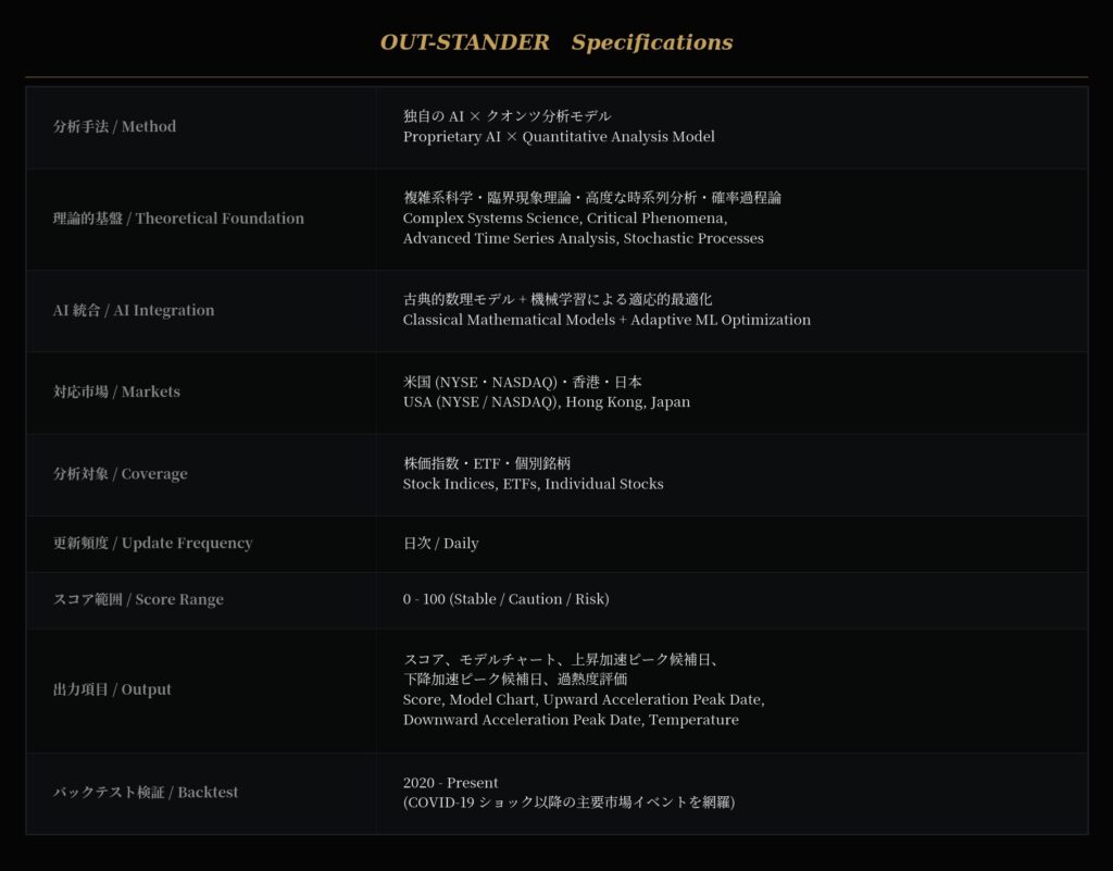 パンデミック、政治的規制、金融引き締め、中央銀行の政策変更、個別企業のバリュエーション崩壊——トリガーは毎回違います。しかし、OUT-STANDERは「原因」ではなく「市場構造の状態」を評価しているため、トリガーの種類に関係なく脆弱性を検出します。