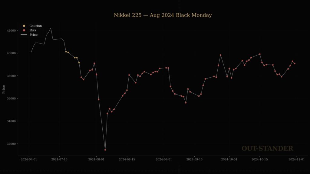 テクニカル分析が「押し目」や「底打ち」と解釈するリスクがある局面で、OUT-STANDERは「市場構造はまだ不安定」と評価し続けていたことになります。