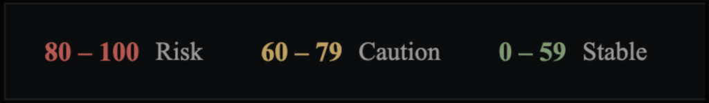 同じように、スコアがCaution(60〜79)を示しているとき、ポジションをどうするかを決めるのは各投資家次第です。OUT-STANDERは判断に必要な情報を、科学に基づいて提供しています。