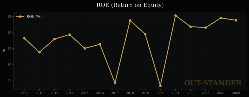ROEの異常に高い数字と横ばい傾向では、